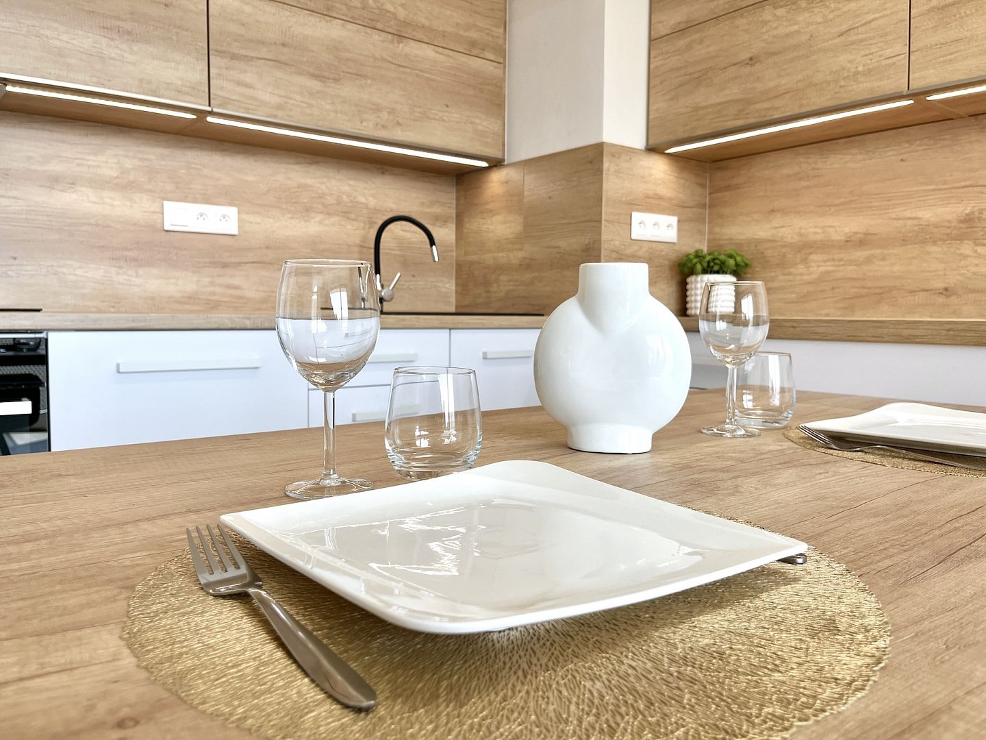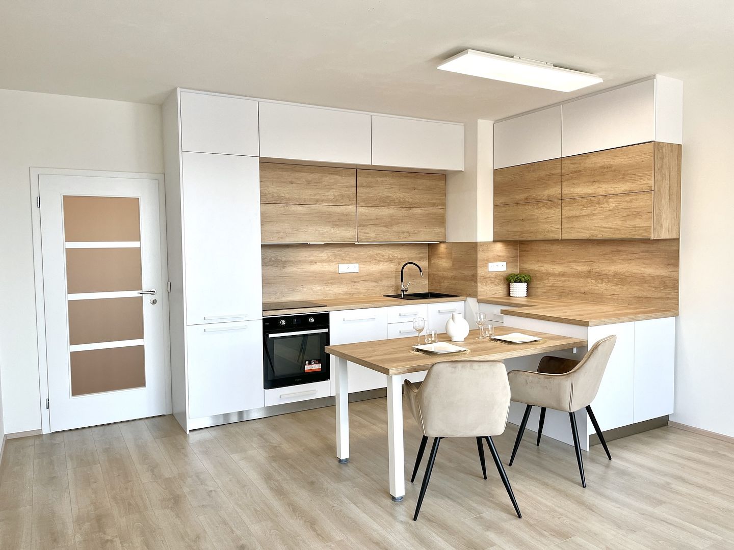 • nadstandardní kuchyňská linka se spotřebiči (vestavná lednice s mrazákem, myčka, horkovzdušná trouba, indukční deska, digestoř) + barový pult, židle a pohyblivý jídelní stůl
