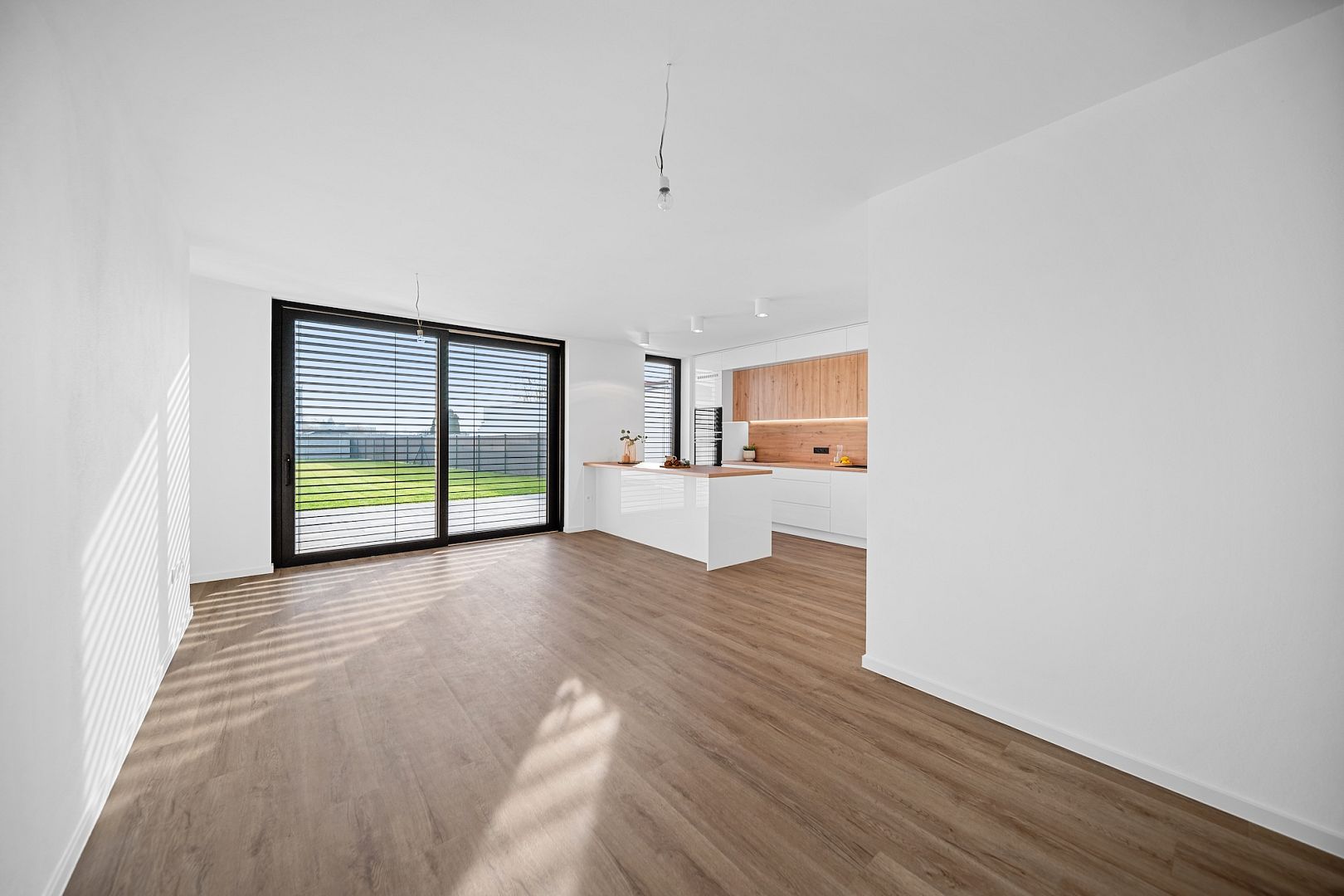 Interiér je nový, světlý a moderní – zkolaudováno bylo na konci roku 2025. V kuchyni je kompletně vybavená moderní bílá linka s ostrůvkem a do obývacího pokoje se o svátcích vejdete s celou rodinou.