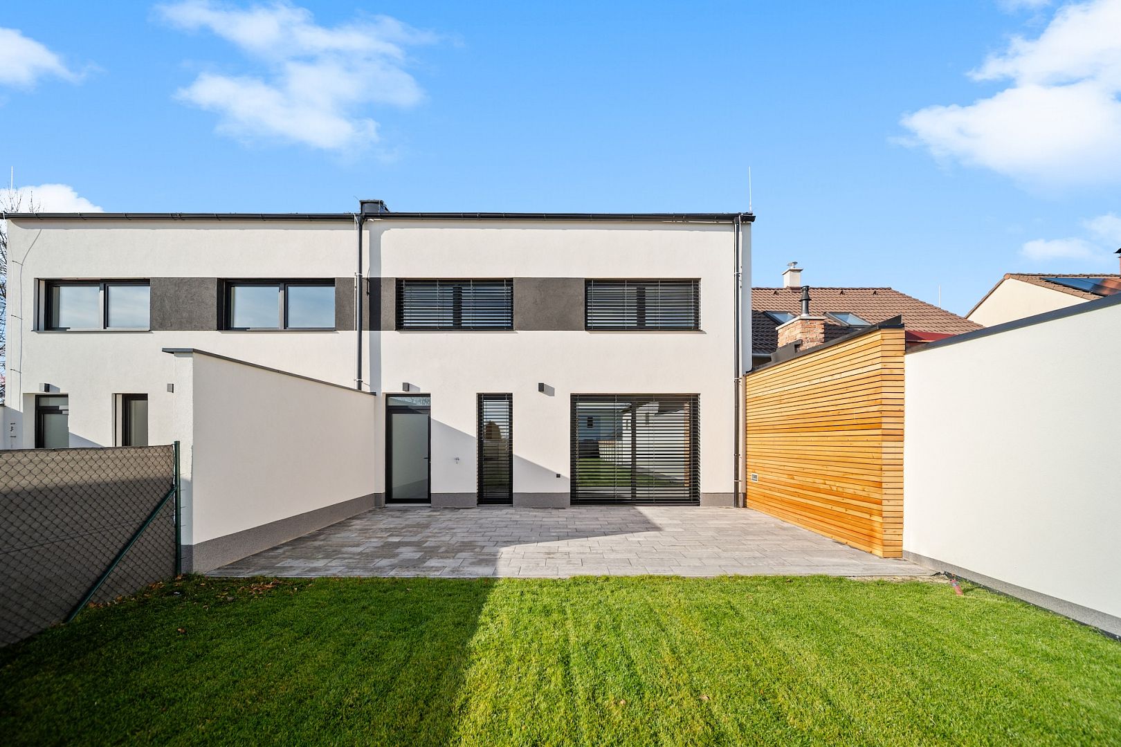 A v létě si ho ještě zvětšíte. Stačí otevřít portál na terasu, kde budete mít absolutní soukromí. Od sousedů vás dělí vysoká zeď a můžete si užívat sluníčka, aniž by vás někdo rušil.