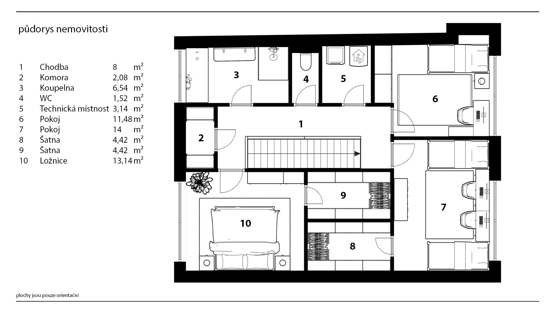 Po schodech vystoupáte do patra, kde jsou tři prostorné ložnice. O místo na odpočinek, práci nebo psaní úkolů tu tak nouzi mít nebudete.