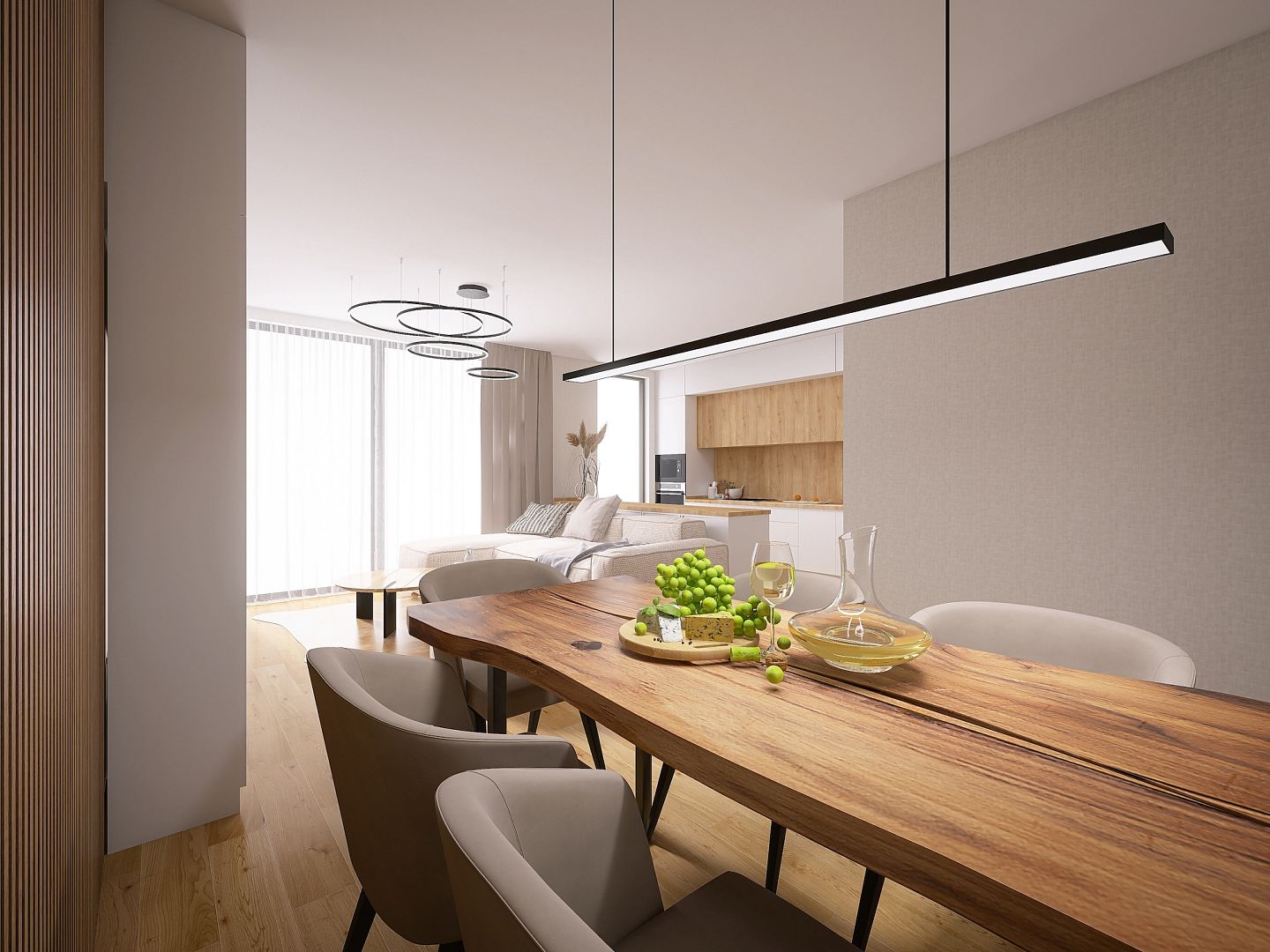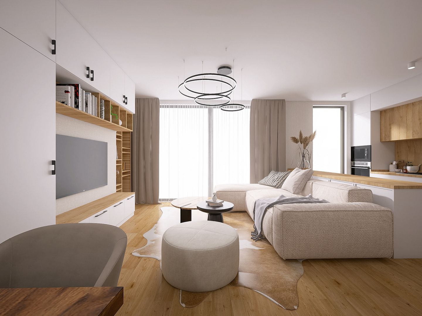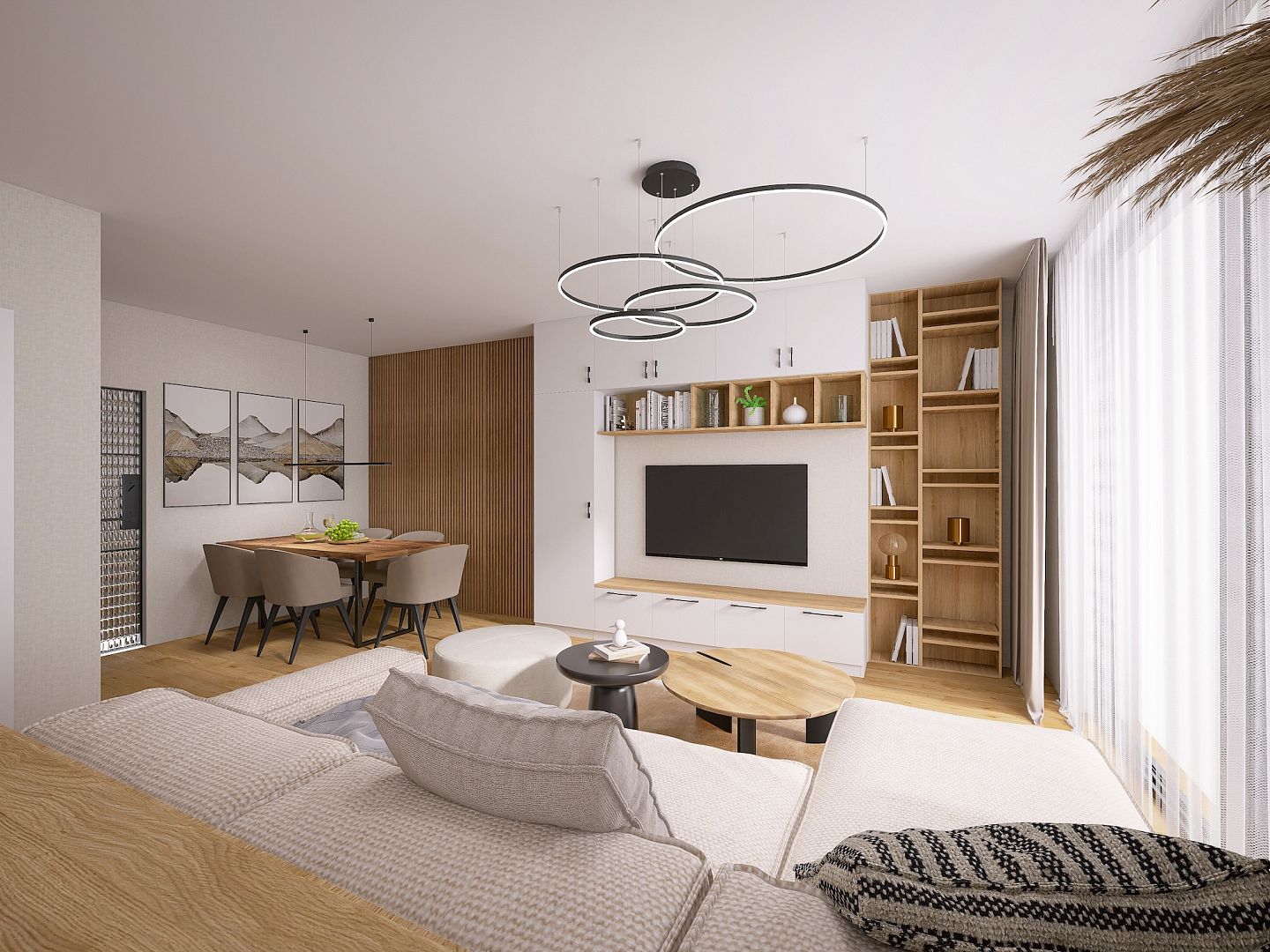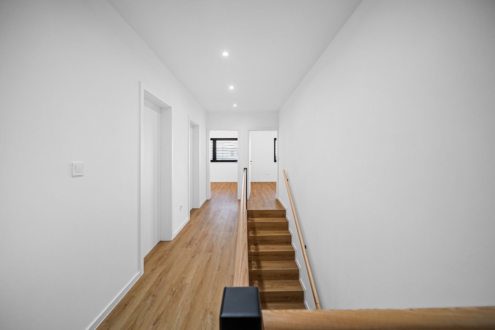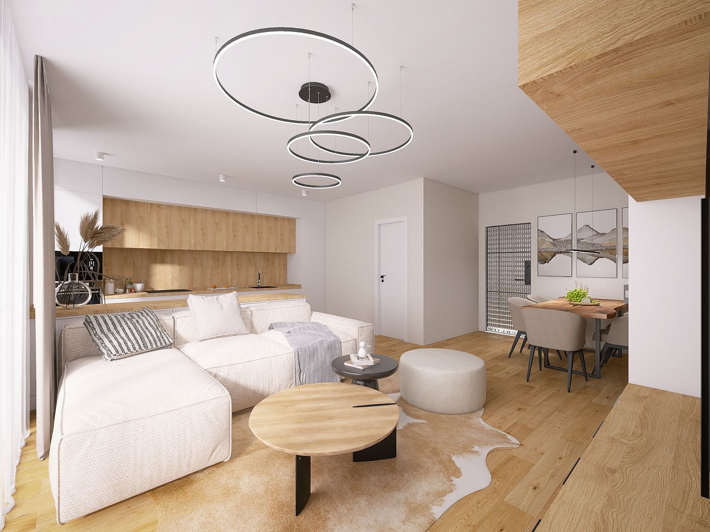 Interiér je nový, světlý a moderní – zkolaudováno bylo na konci roku 2025. Kuchyňskou linku si dokončíte podle svých představ a do obývacího pokoje se o svátcích vejdete s celou rodinou.