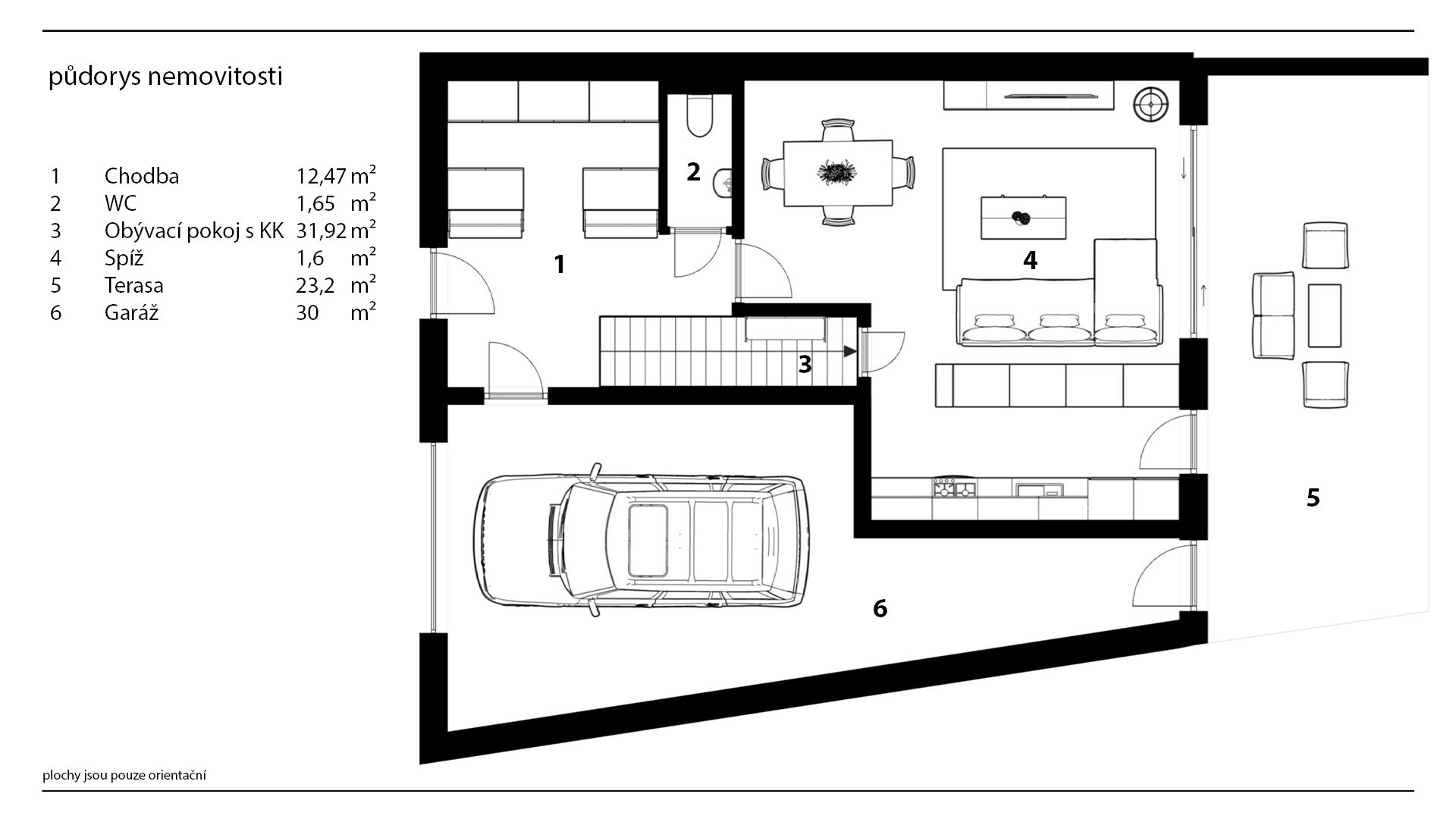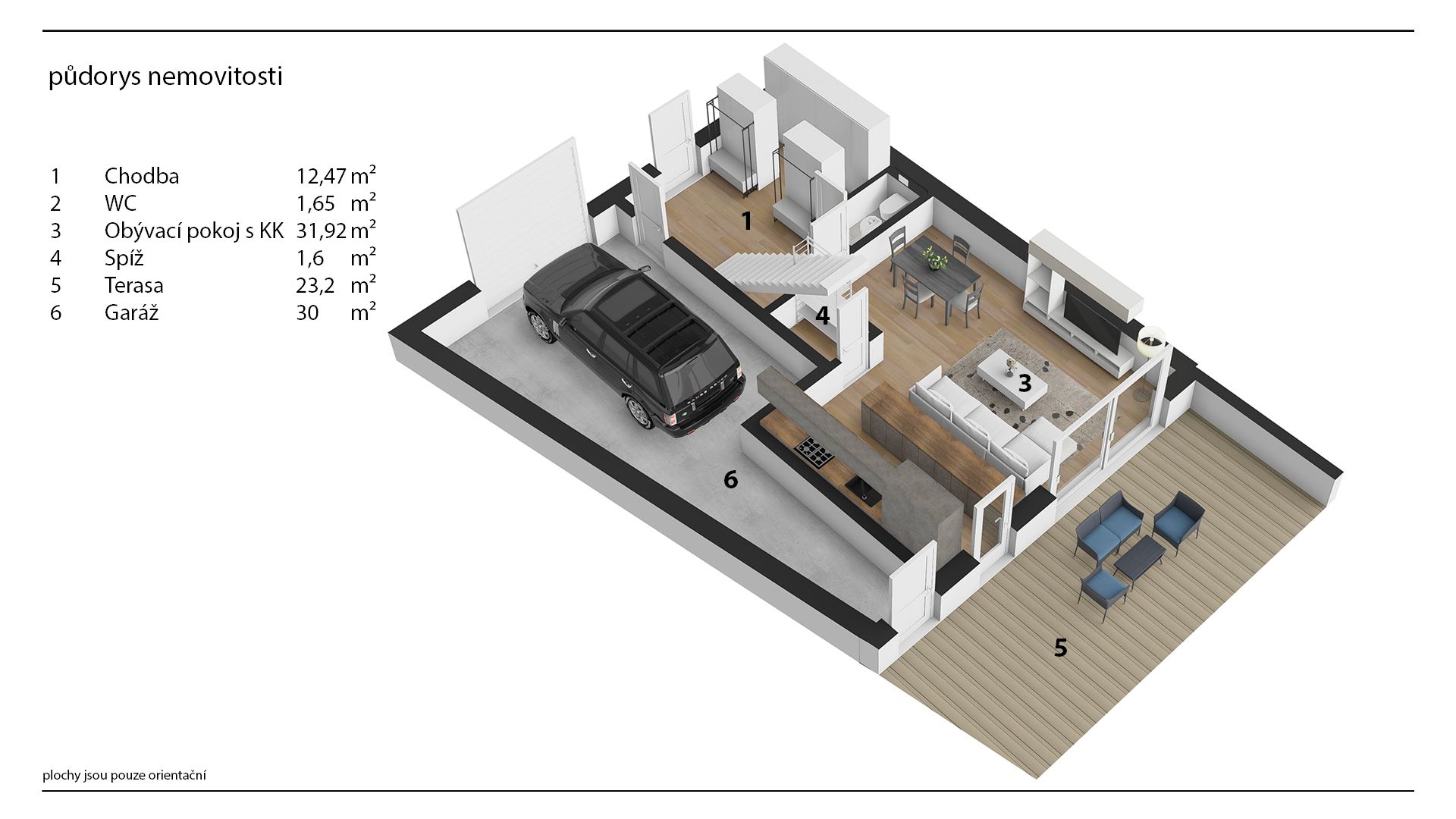 Dům je patrový, má dispozici 4+kk a výměru 154 m2. V přízemí je obývací pokoj s přípravou na kuchyni, v zádveří toaleta a vstup do garáže, v patře tři ložnice, koupelna a samostatné WC.