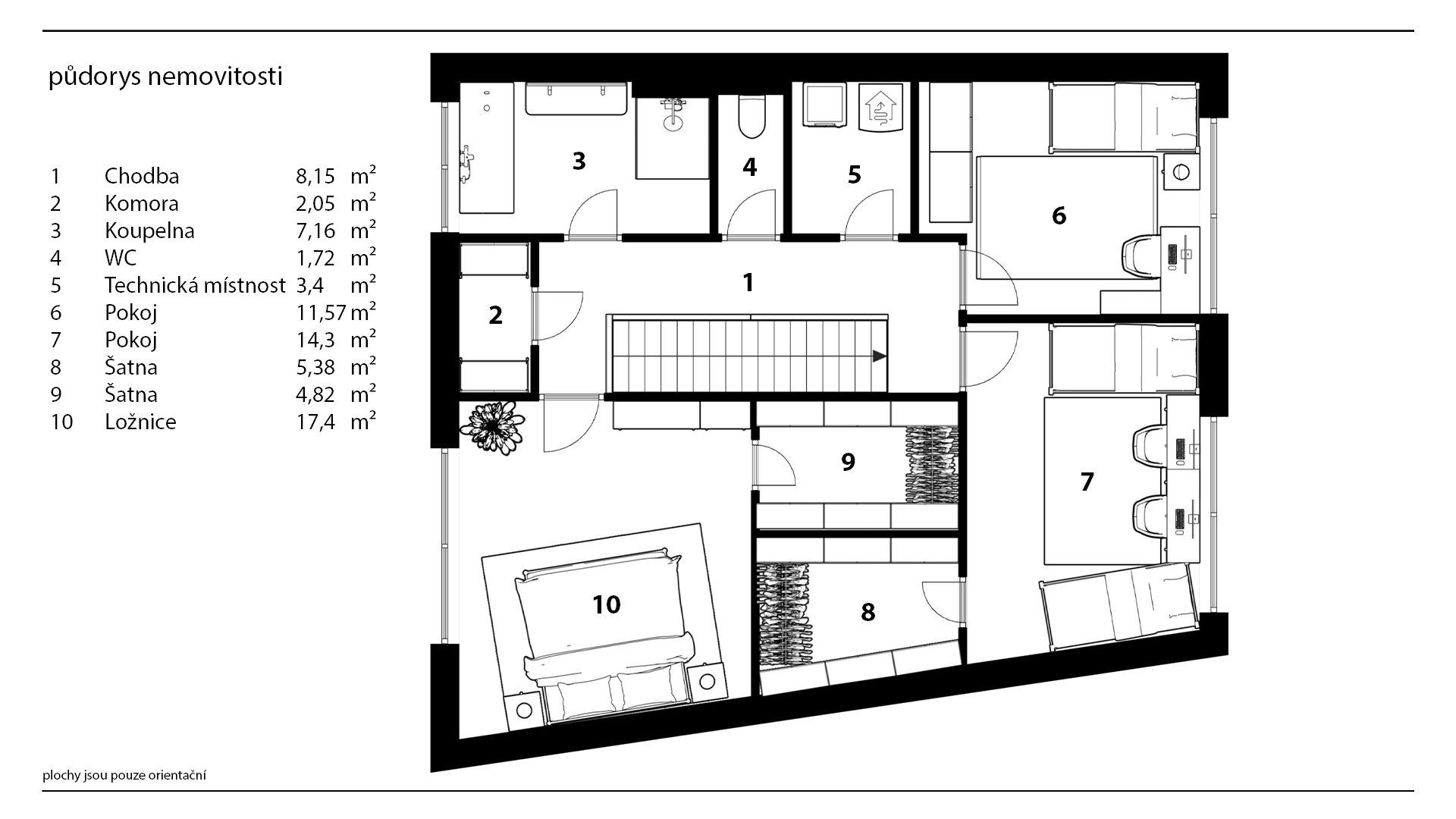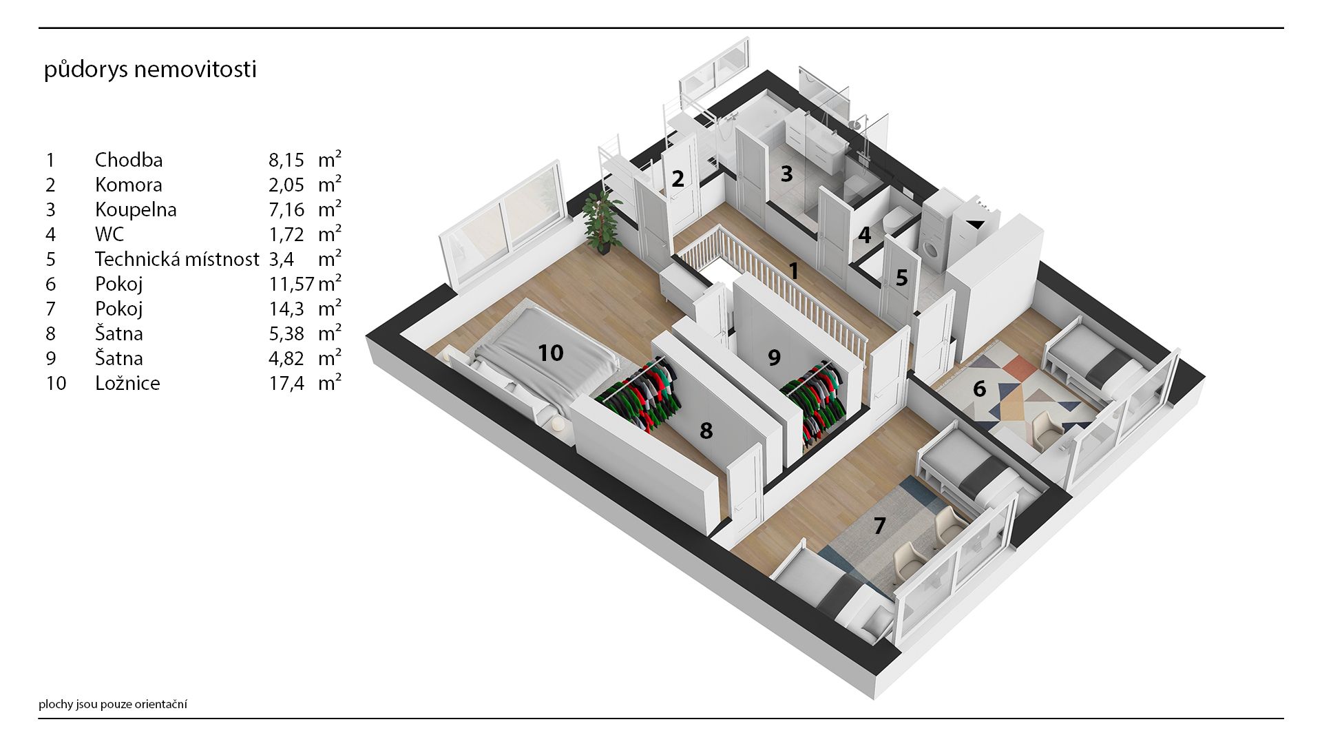Po schodech vystoupáte do patra, kde jsou tři prostorné ložnice. O místo na odpočinek, práci nebo psaní úkolů tu tak nouzi mít nebudete.