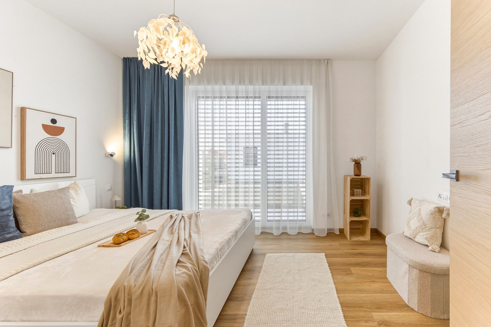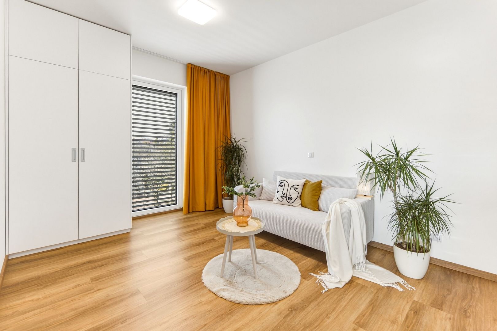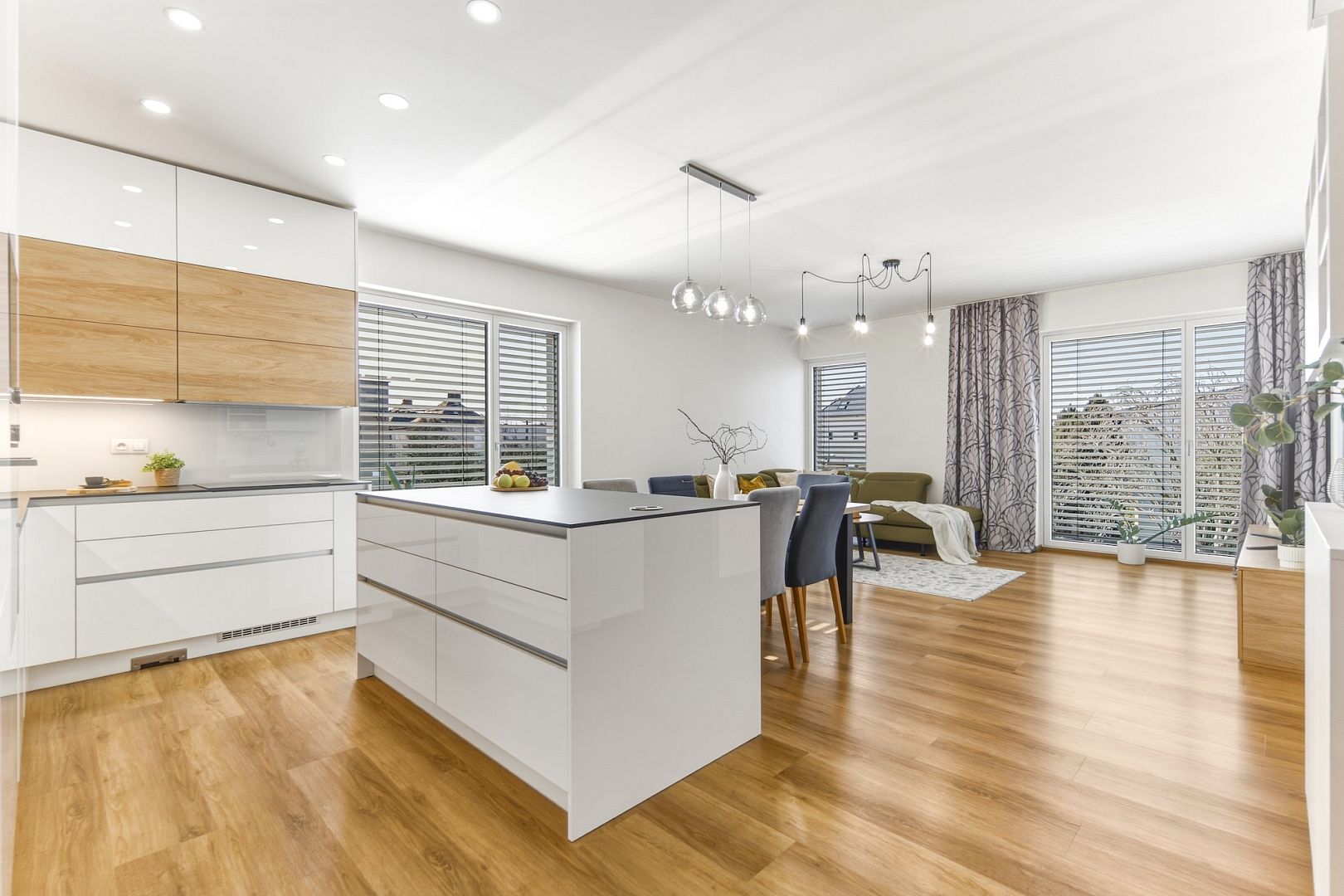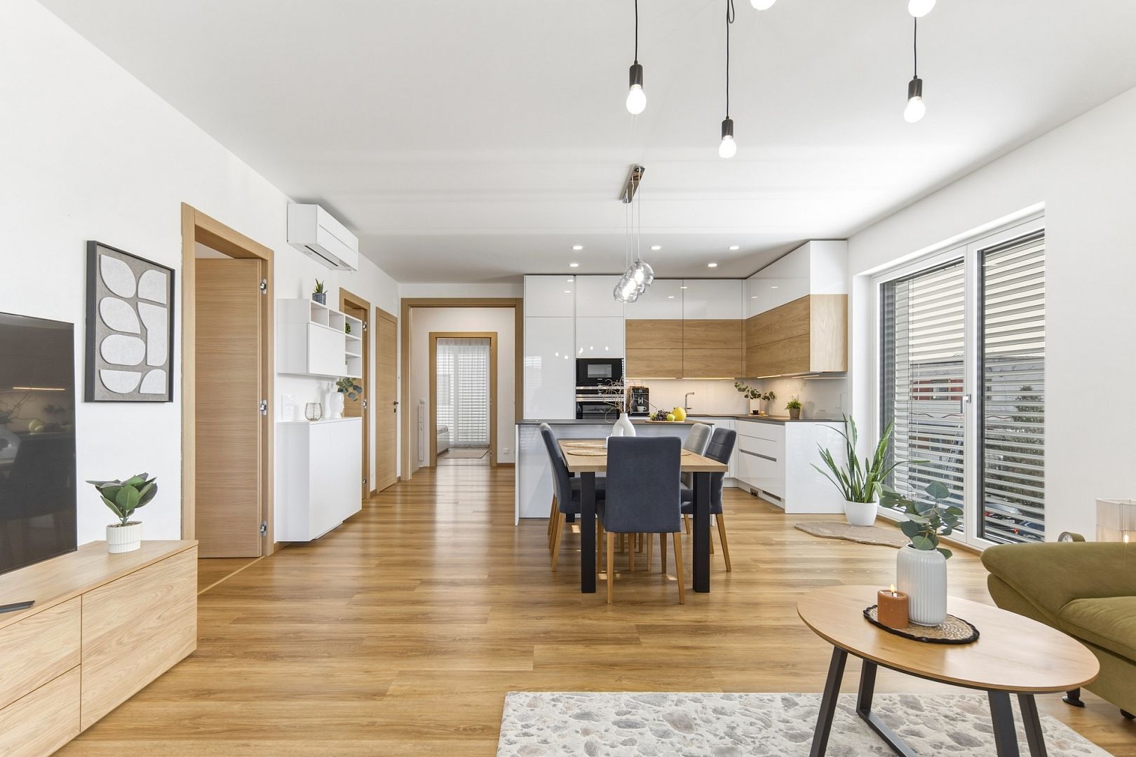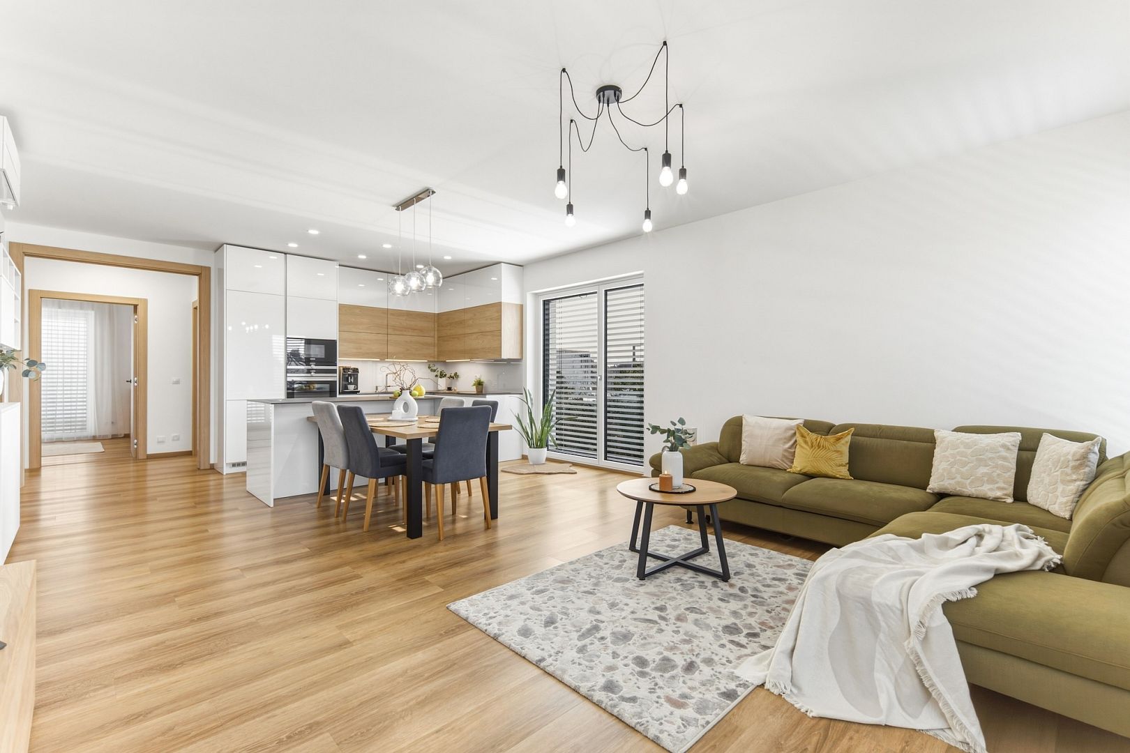Jeho srdcem je obývák s výměrou téměř 39 m2 a nadstandardně zařízenou kuchyní. Velká francouzská okna pouštějí dovnitř maximum světla a posuvné dveře ho oddělují od dvou ložnic, ze kterých budou například hezké dětské pokojíky. A protože jsou stěny odhlučněné, usínající děti neprobudíte ani filmový večerem.