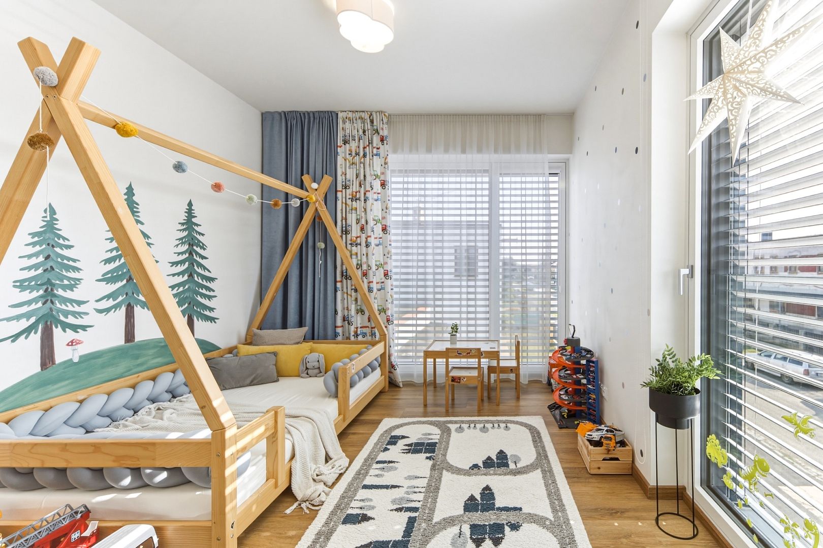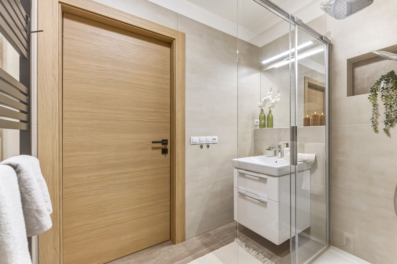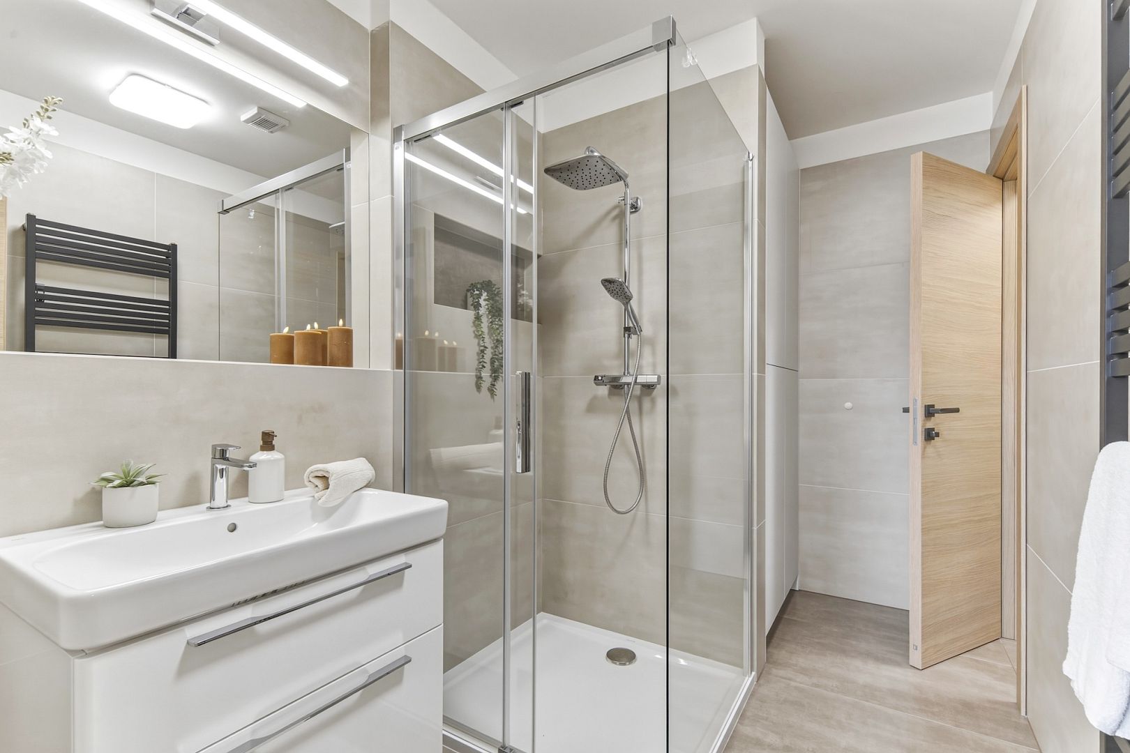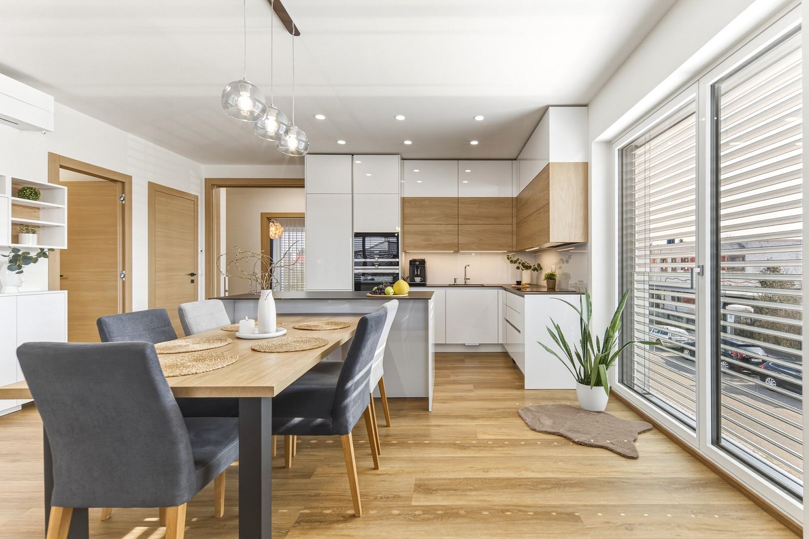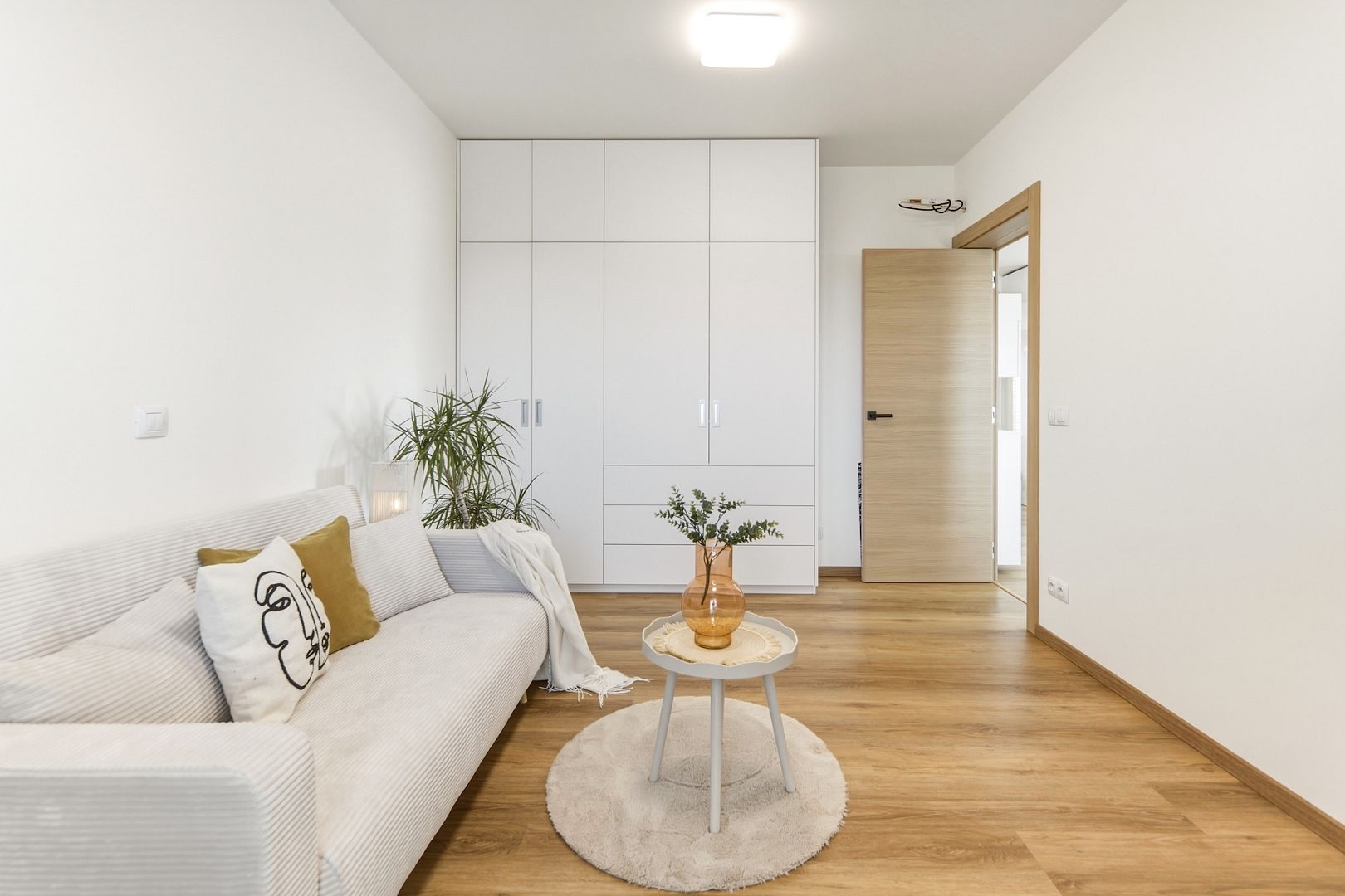 Jeho srdcem je obývák s výměrou téměř 39 m2 a nadstandardně zařízenou kuchyní. Velká francouzská okna pouštějí dovnitř maximum světla a posuvné dveře ho oddělují od dvou ložnic, ze kterých budou například hezké dětské pokojíky. A protože jsou stěny odhlučněné, usínající děti neprobudíte ani filmový večerem.