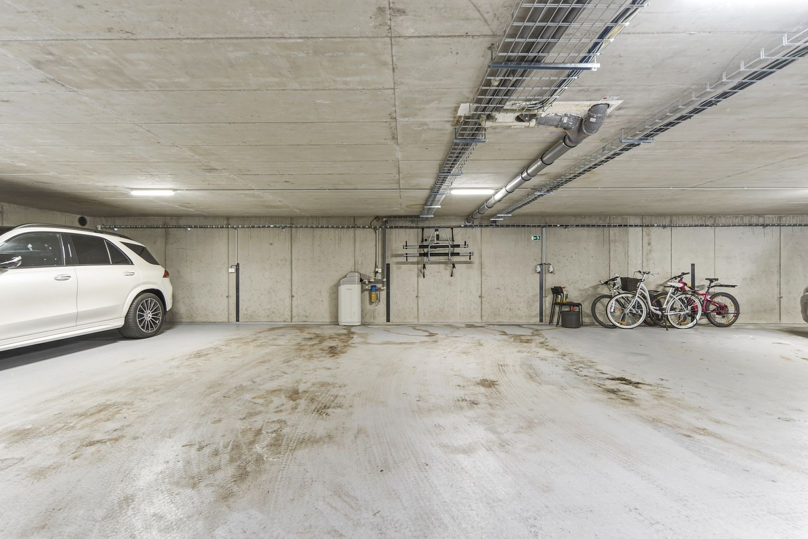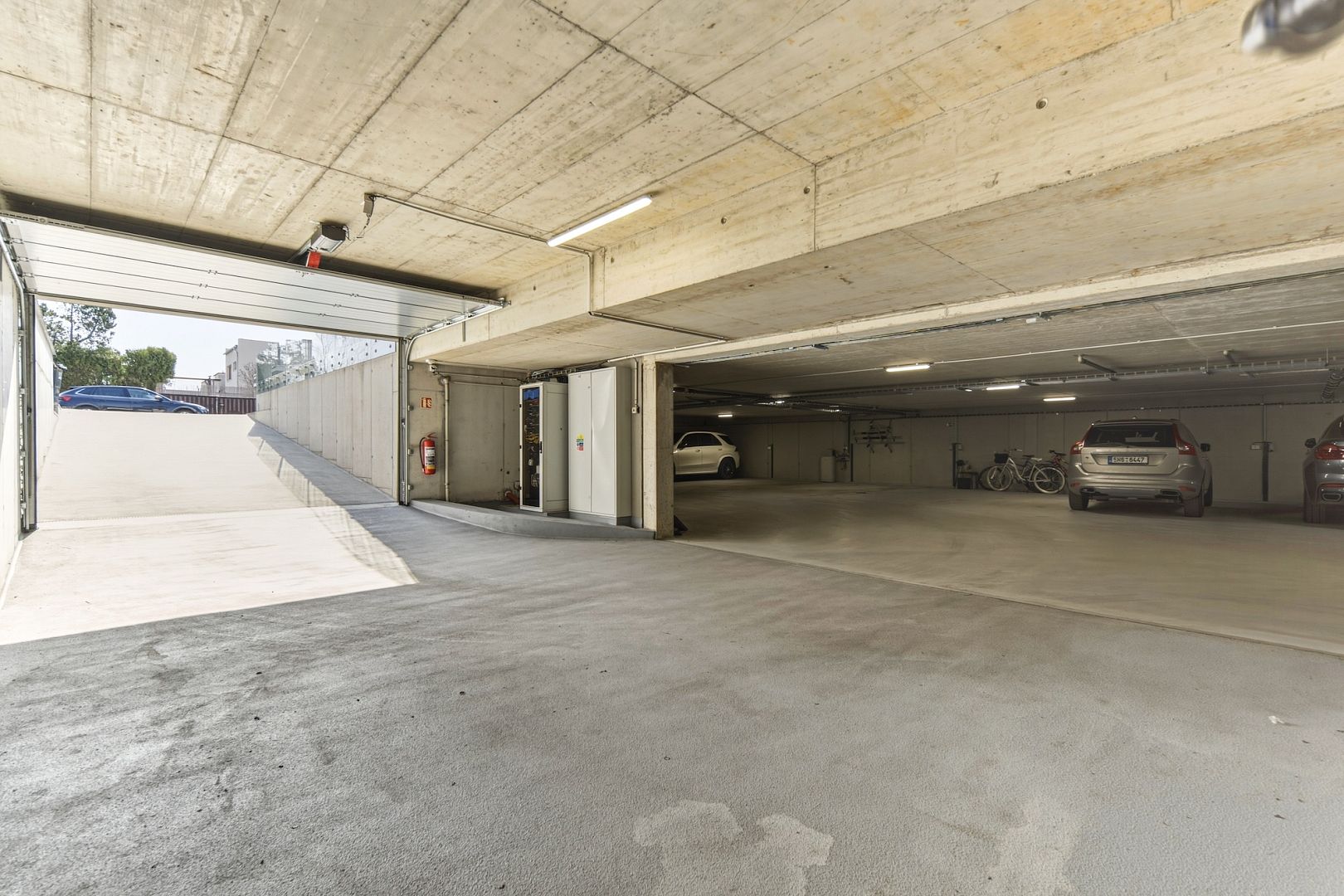 Ani s parkováním si hlavu lámat nemusíte. K bytu patří dvě garážová stání i se zásuvkou na nabíjení elektroauta. Prodávají se samostatně za 745 tisíc Kč/stání – jejich cena není zahrnuta v ceně bytu.