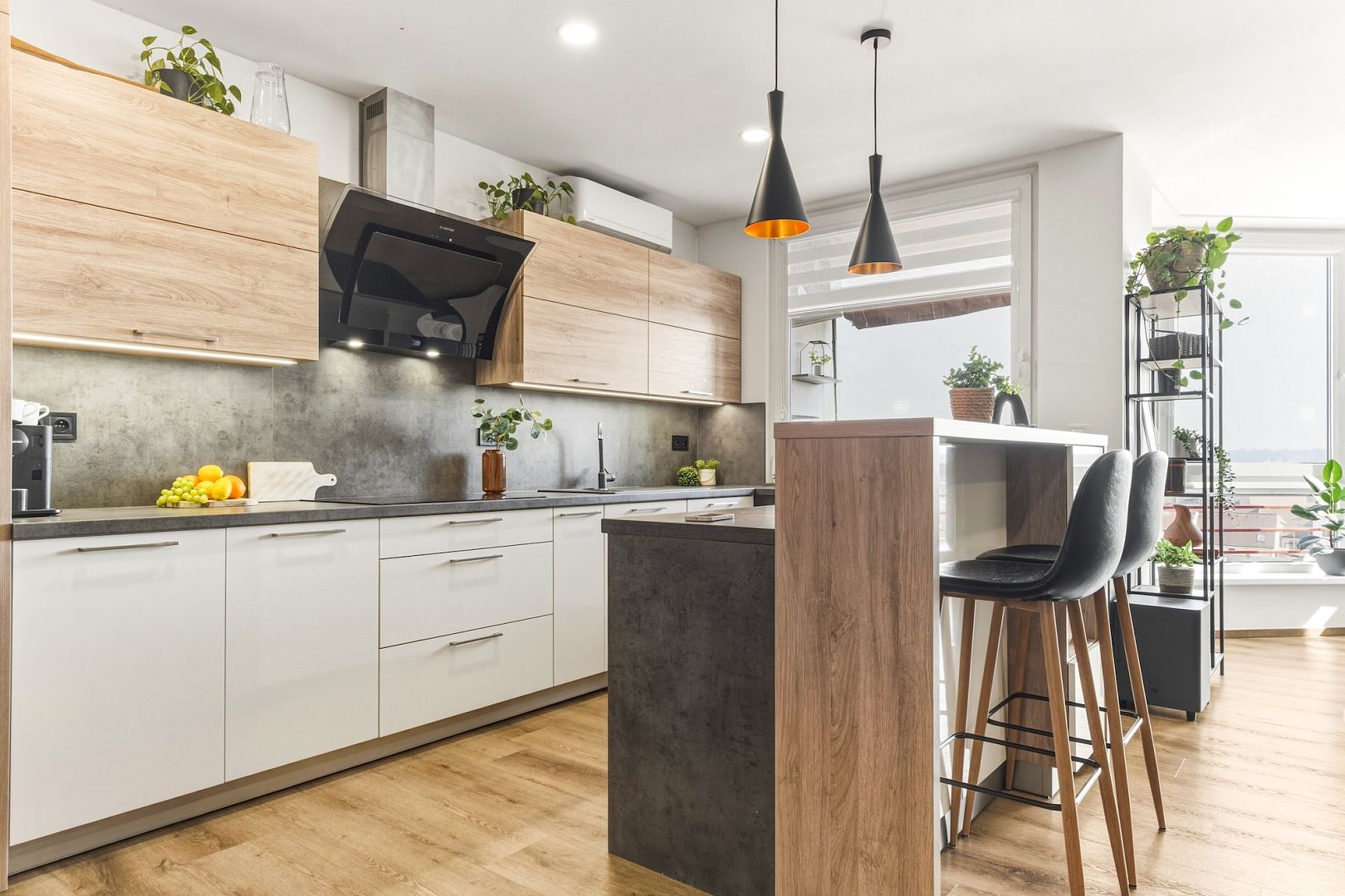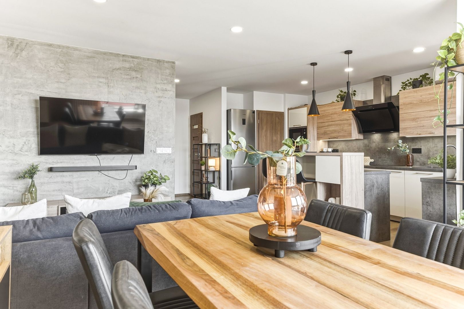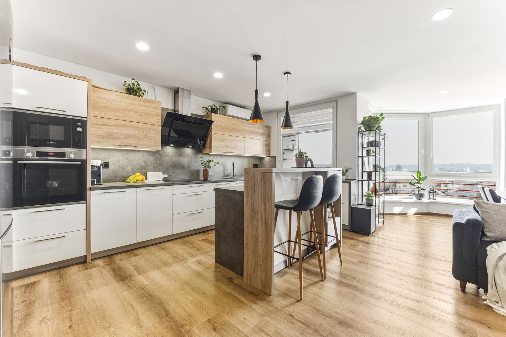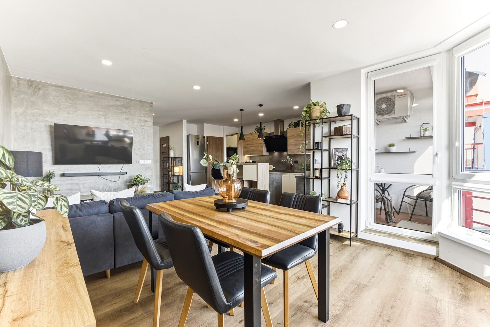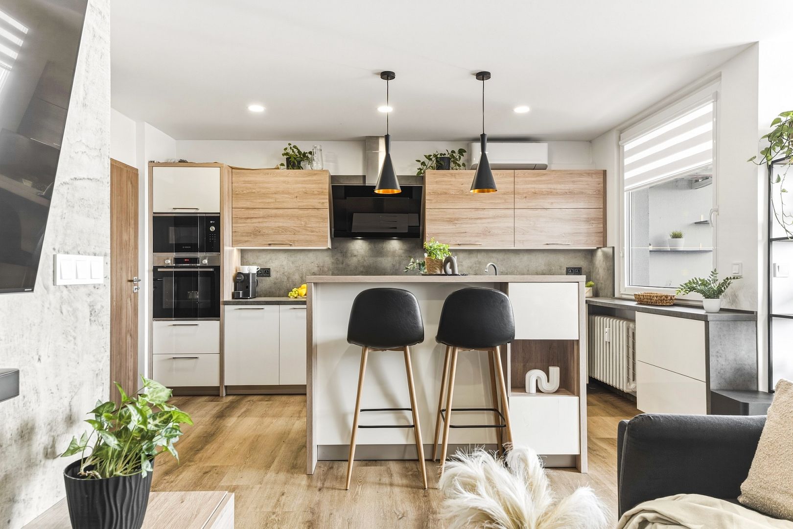 Srdcem bytu je obývací pokoj se stylovou kuchyňskou linkou, která má všechny potřebné spotřebiče a barový ostrůvek. Velká okna celý prostor zalévají denním světlem – perfektně uvidíte na vaření i knížku. Pokoj je klimatizovaný, takže tady budete mít pohodu i v létě.