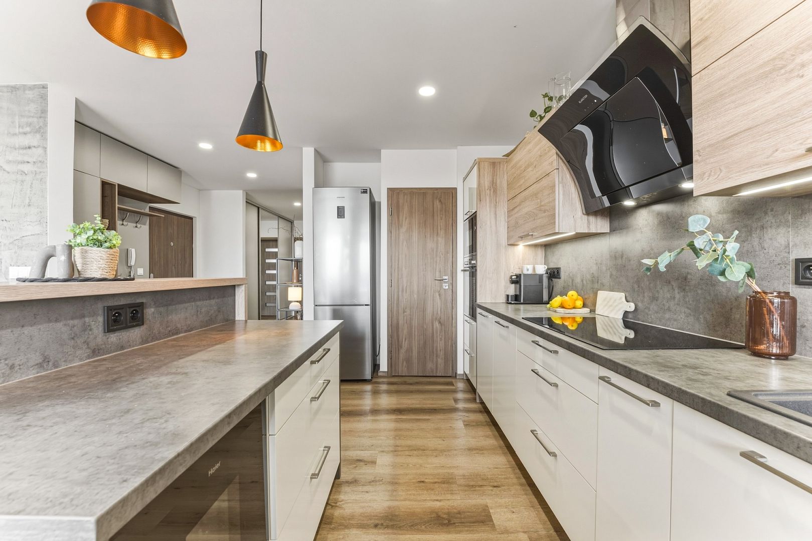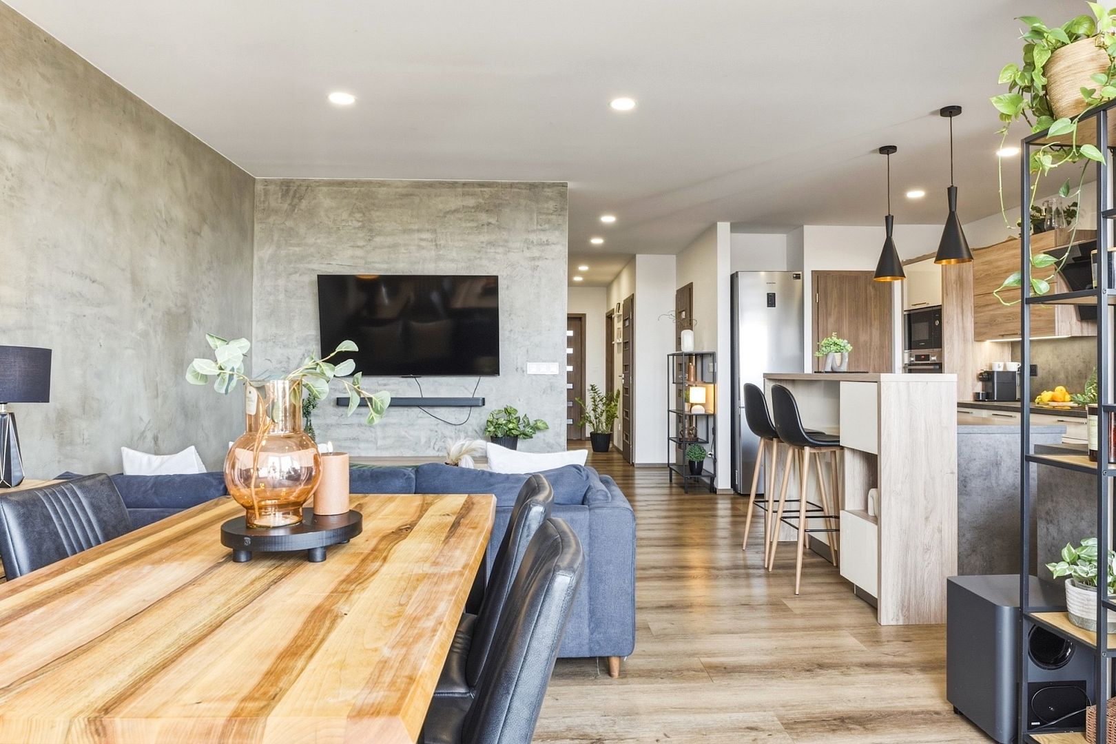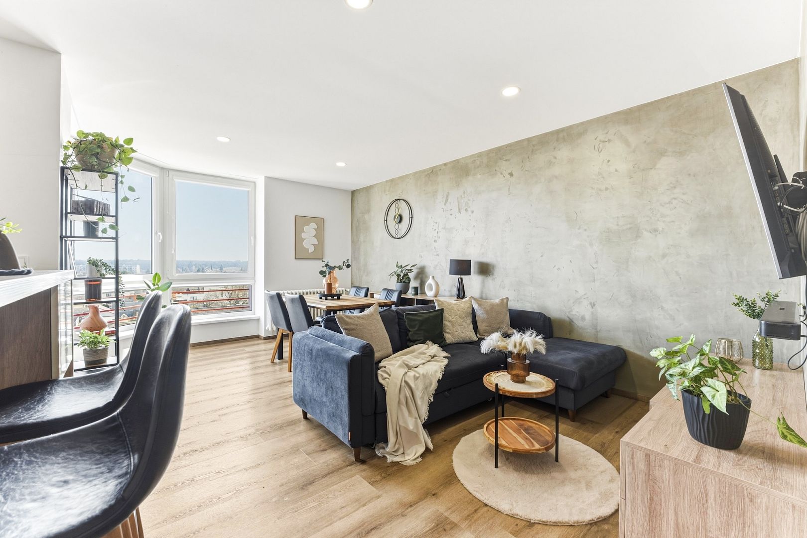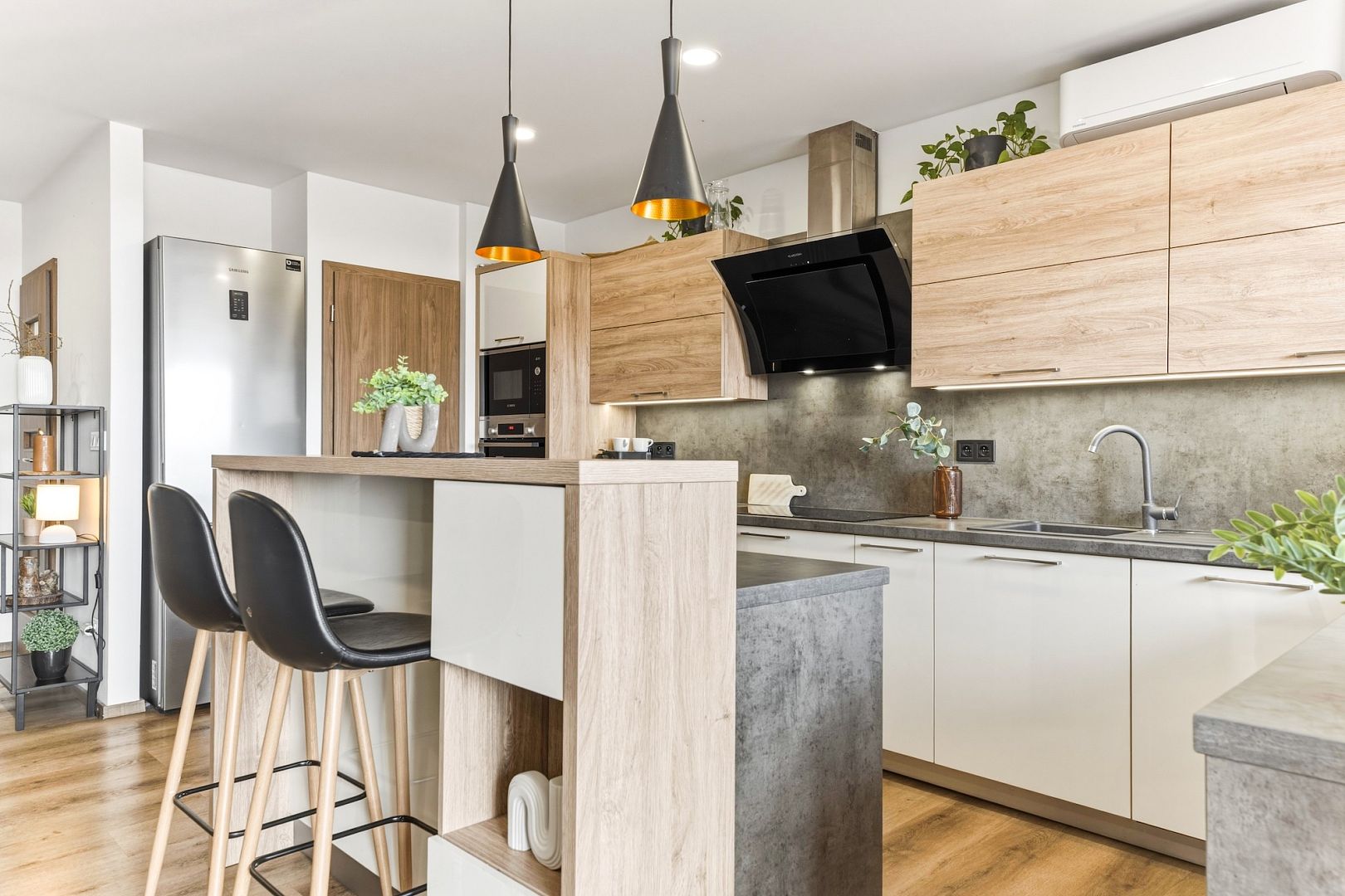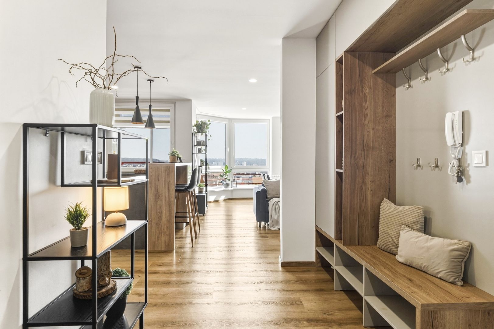 Srdcem bytu je obývací pokoj se stylovou kuchyňskou linkou, která má všechny potřebné spotřebiče a barový ostrůvek. Velká okna celý prostor zalévají denním světlem – perfektně uvidíte na vaření i knížku. Pokoj je klimatizovaný, takže tady budete mít pohodu i v létě.
