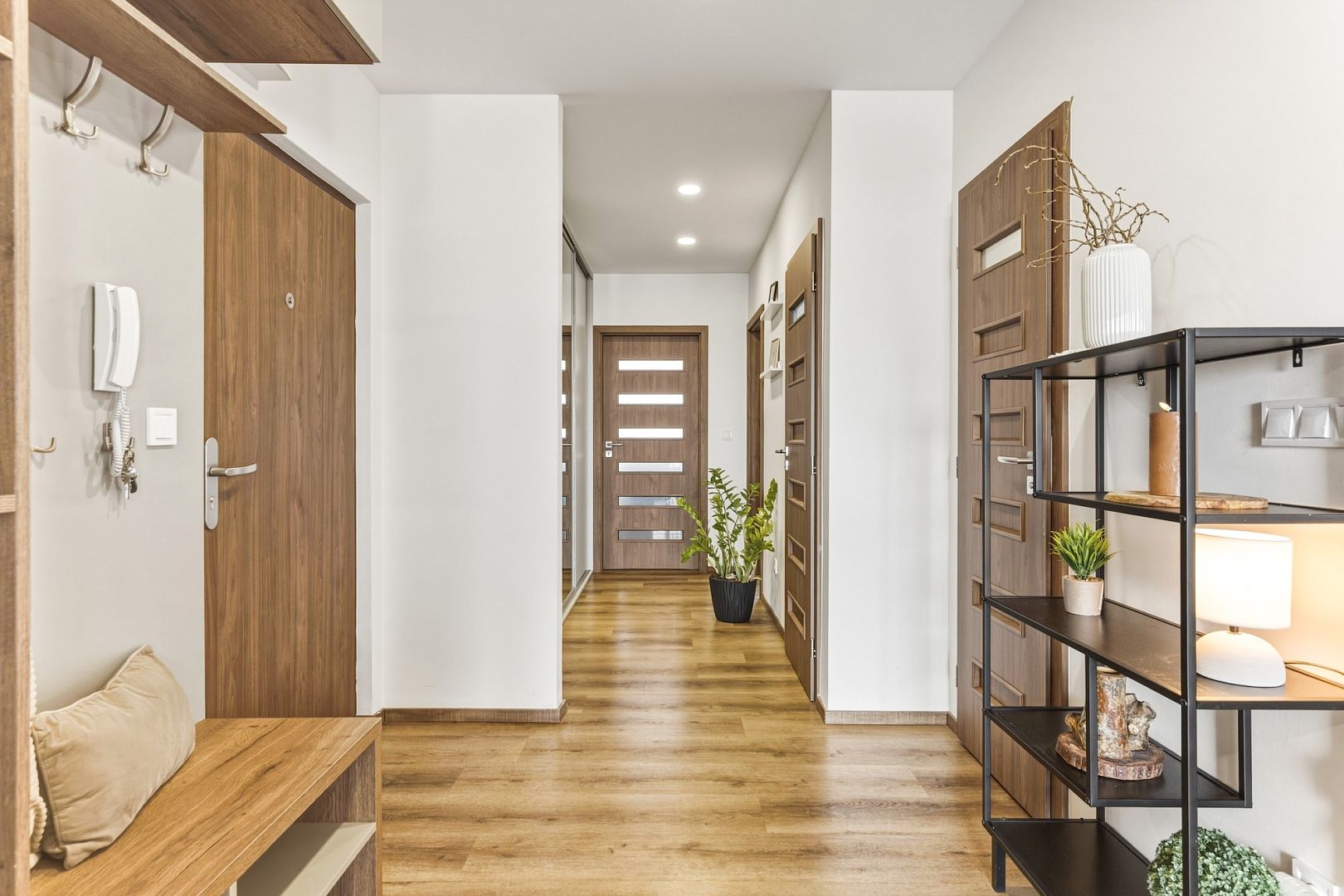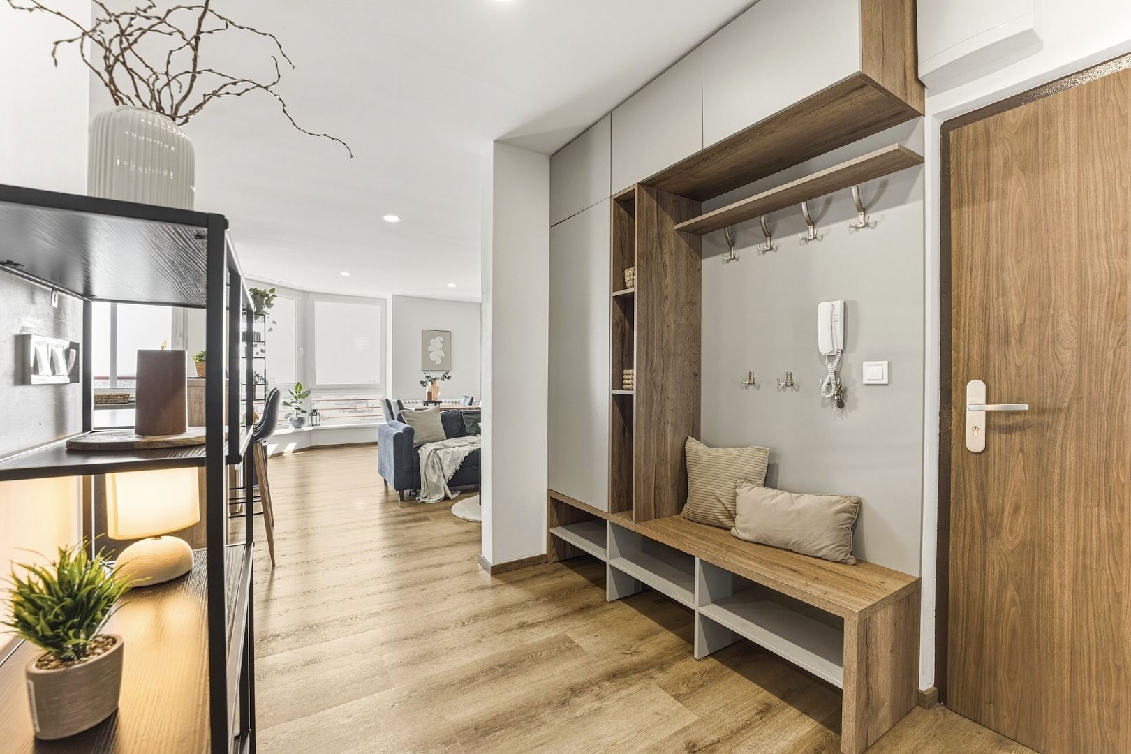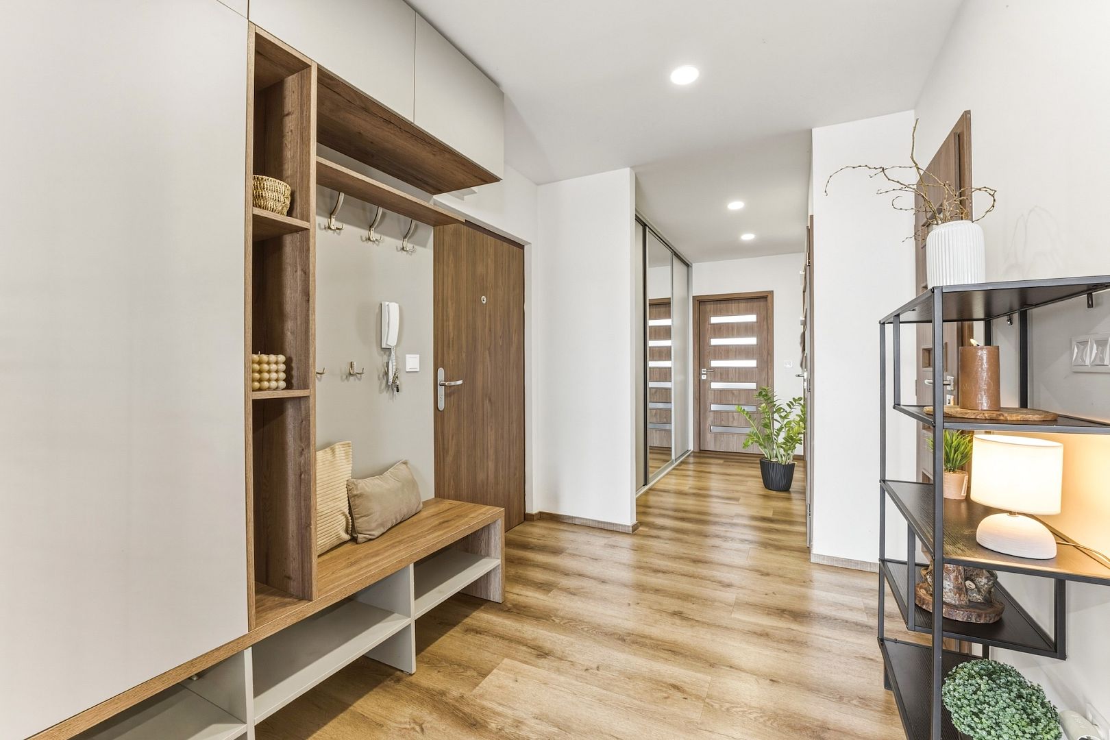 Hned za vstupními dveřmi Vás přivítá praktické zádveří a chodba s velkými vestavěnými skříněmi. Tady budete mít dost místa na všechny zimní kabáty.