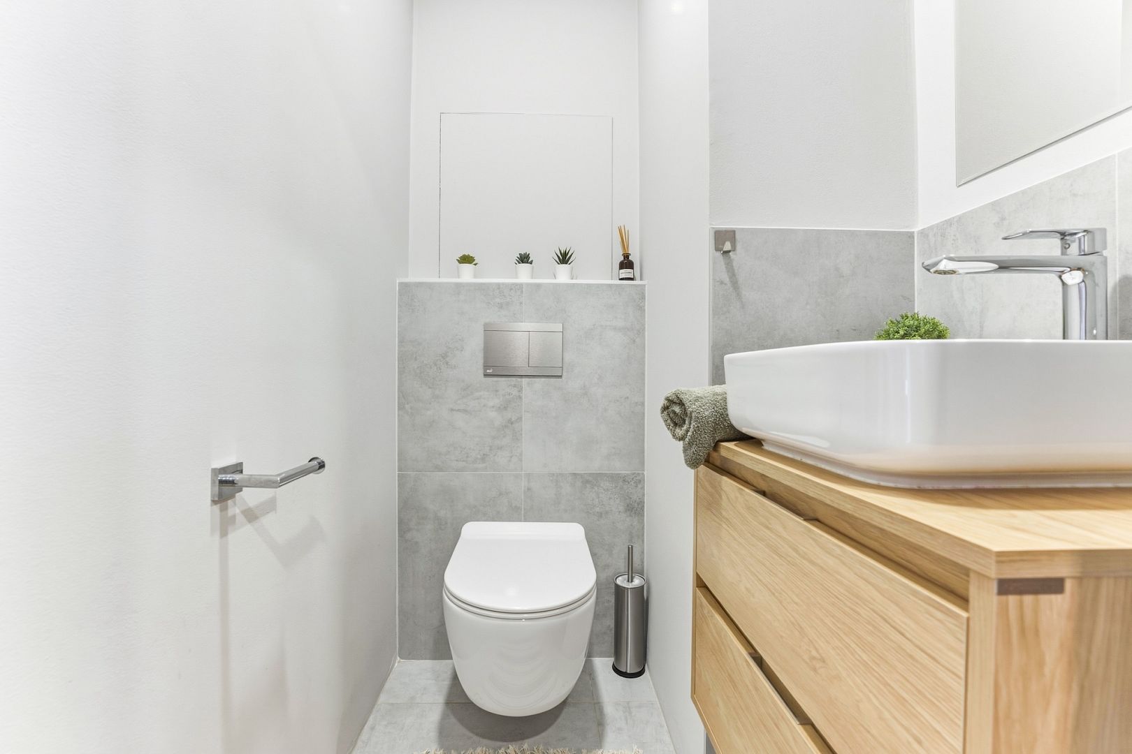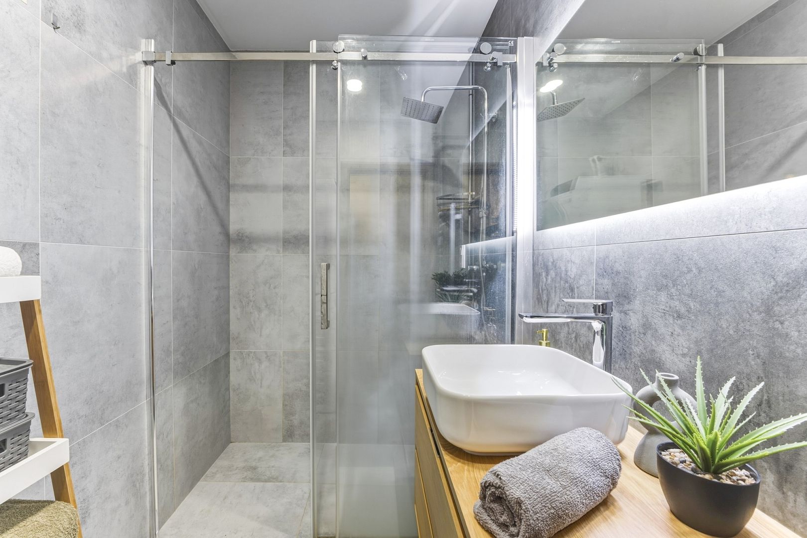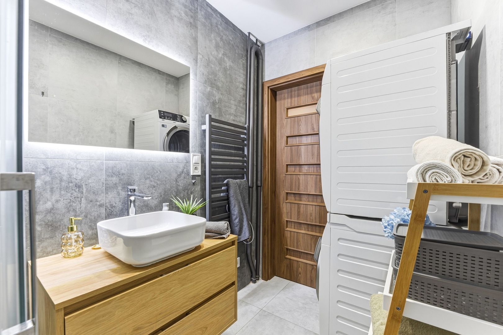 V moderní koupelně je prostorný sprchový kout a místo na pračku se sušičkou, WC je samostatné.