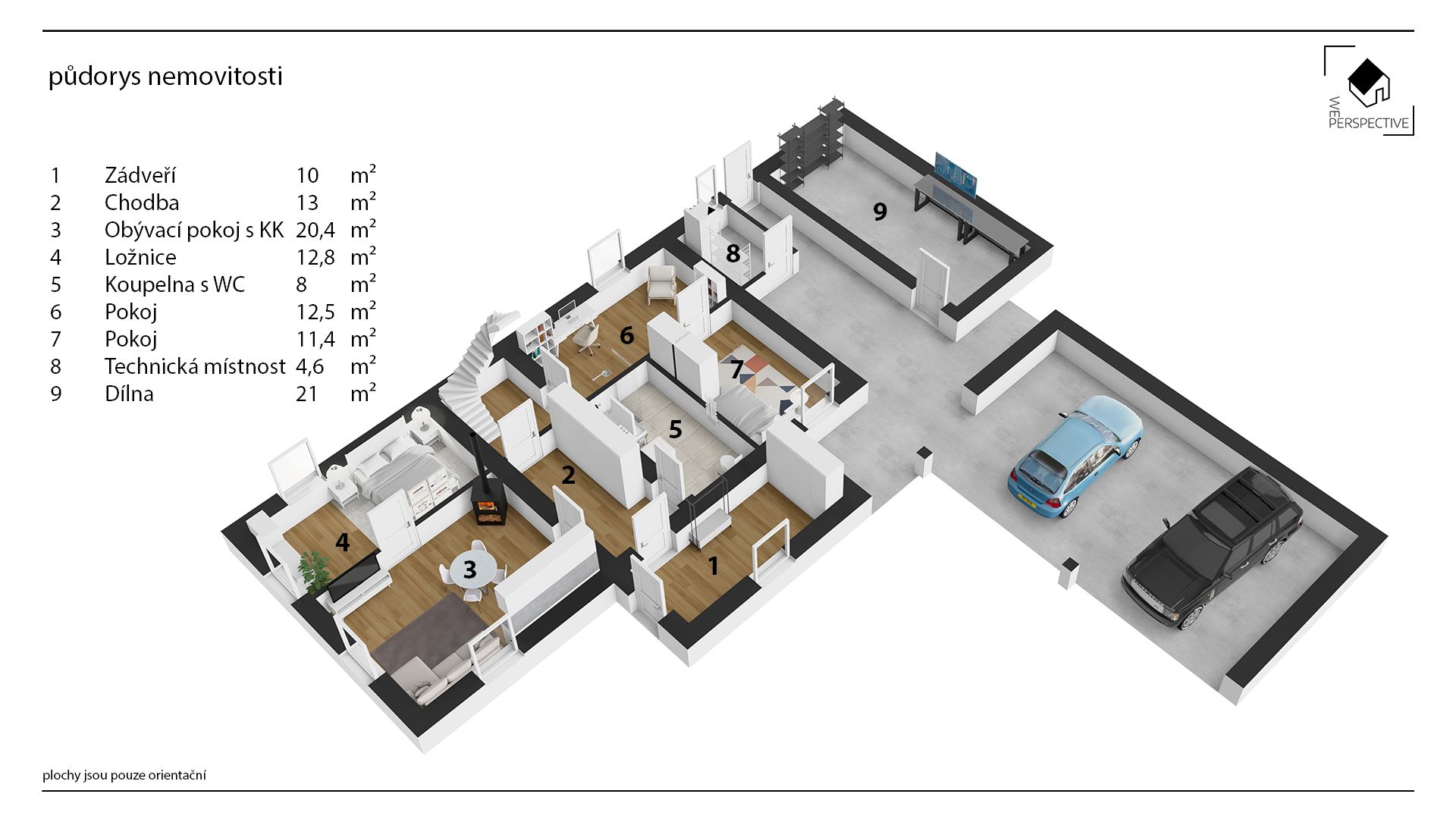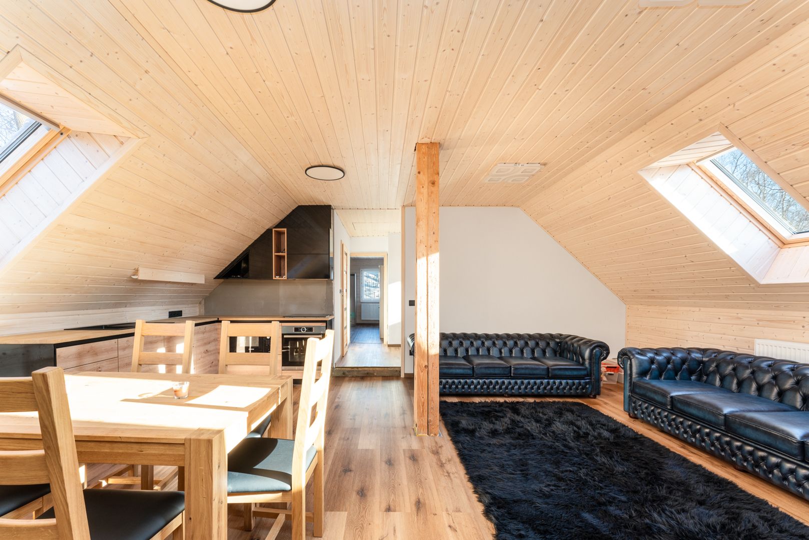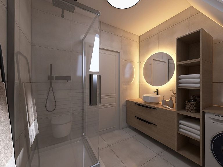 • 1st floor 113,7 sqm - 2+kk - living room with kitchen and fireplace, bedroom, bathroom with shower and toilet. Heating of the house is provided by a heat pump on the principle of water-air. Another option on the 1st floor is a pleasant fireplace heating with distribution to the hallway, bedroom and living room. In the bathroom heating ladder with the possibility of connection to the heat pump.
