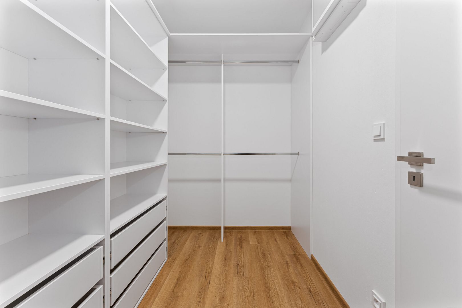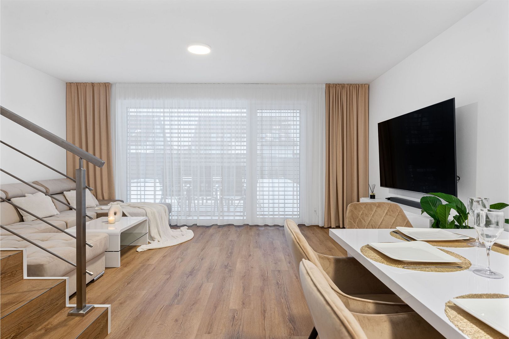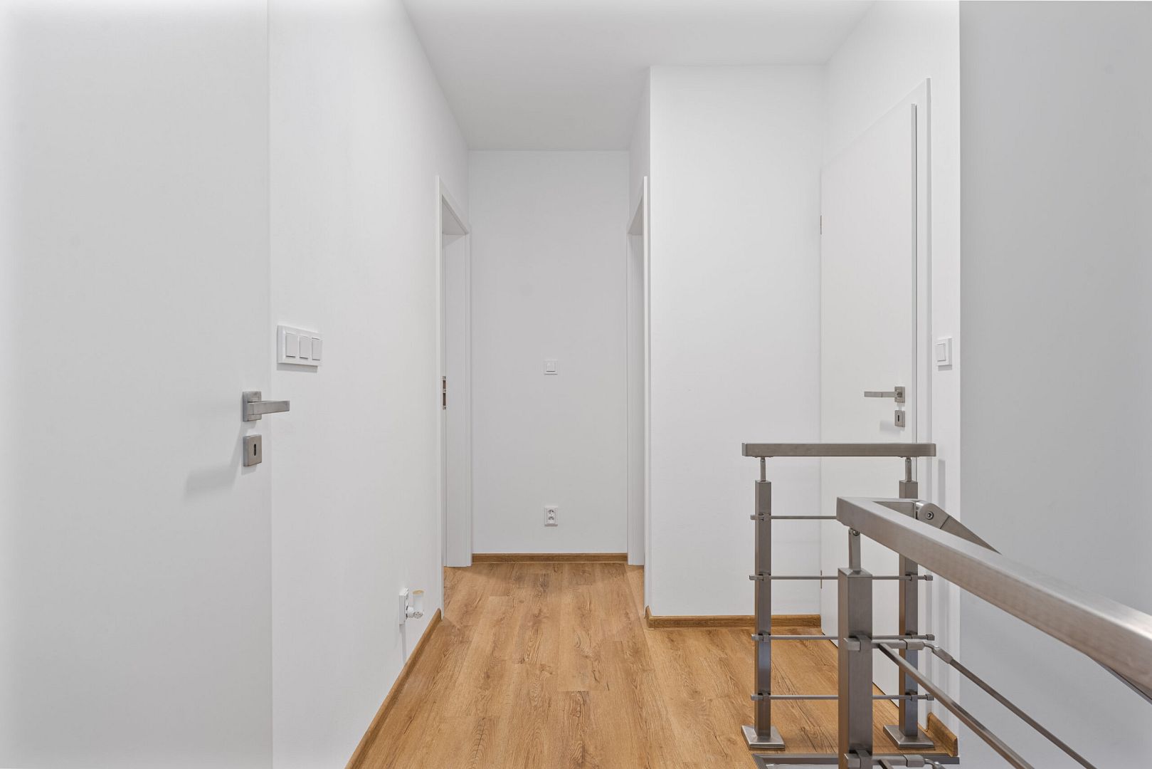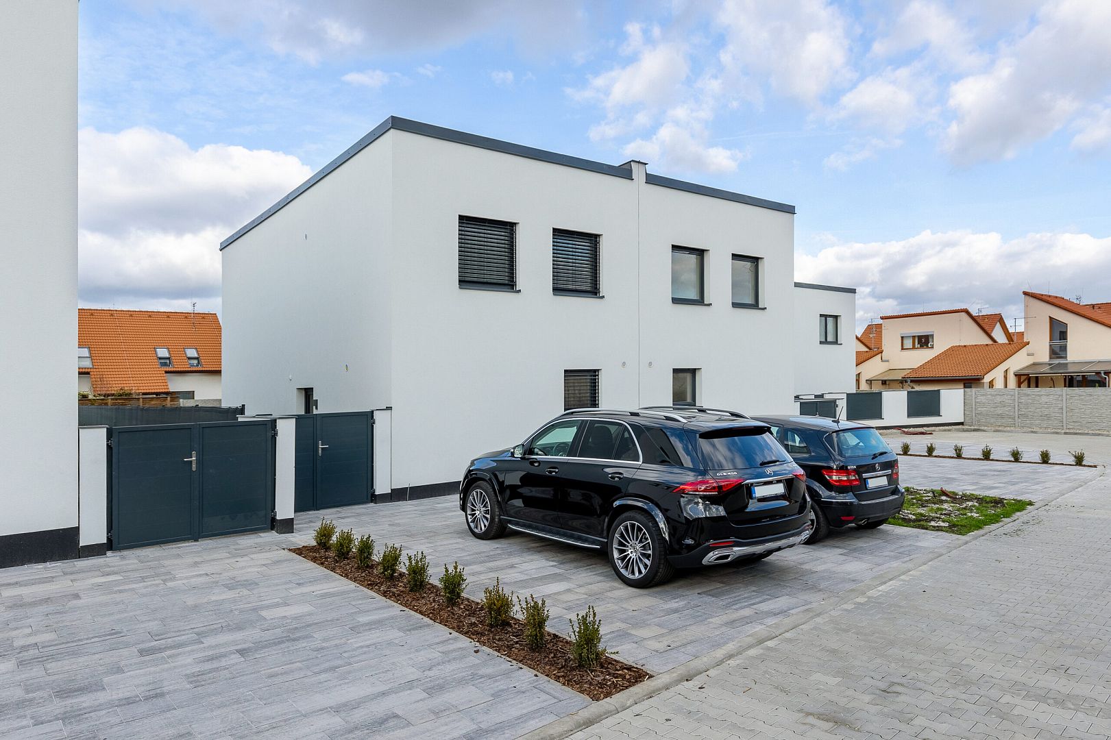 During the tour you will certainly be impressed by the floor plan division of the individual rooms, which has been thoroughly thought out and thanks to which there is a large amount of storage space. Women will also be pleased to find a dedicated space for a large dining table where you can enjoy dinner together. One of the landmarks of the ground floor is the large French doors, which provide quick access to the garden and plenty of light for your interior. We want the highest quality for you, which is why there are Sapeli interior doors and Hansgrohe taps throughout the house.